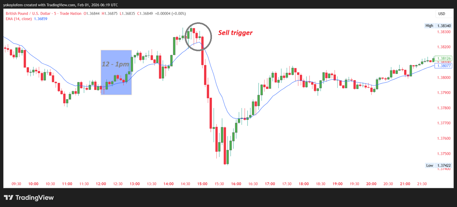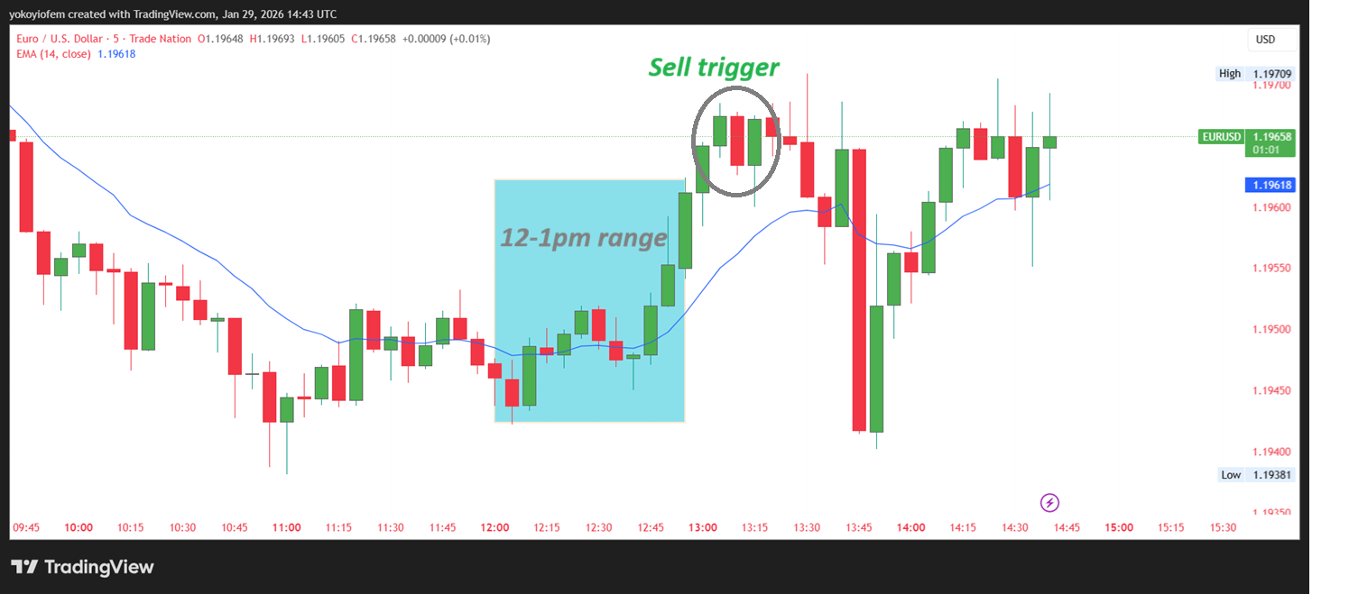 I siimply draw a box to mark the range of the 12 pm to 1 pm hour then wait for price to breakout of the range. If the breakout results in a reversal, then i trade the direction of the reversal.