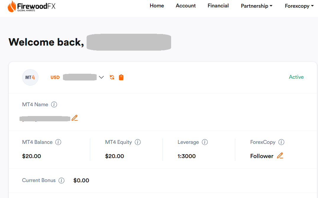 You need to trade at least once every 5 days to let Firewoodfx know you are serious about the bonus if not they will terminate it. The trading platform is MT4 and EAs & Copy trading is not permitted.