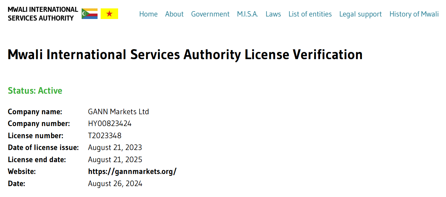 Gann Markets is regulated by Mwali International Services Authority (MISA) which is a low tier forex broker regulator thus making Gann Markets a high risk broker.