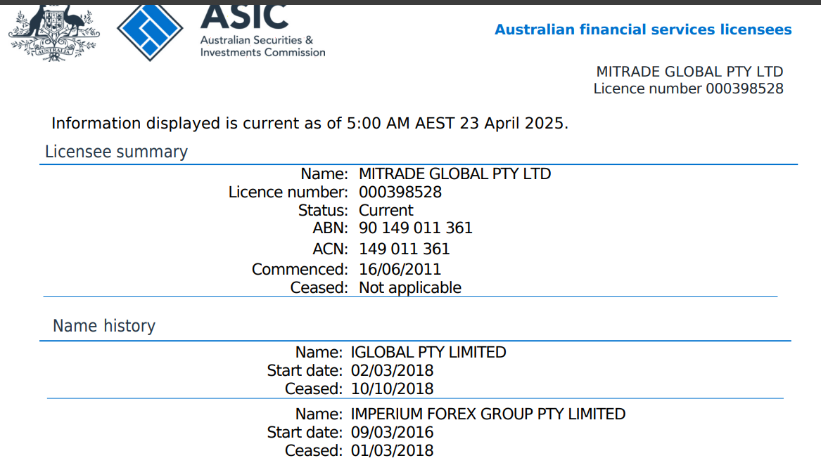 I also noticed that in Australia, Mitrade has undergone some name changes from Forex Central Trading in 2011, to You Trade Capital Markets in 2014, to Golden Sky Australia LTD in 2015, to Australian Foreign Exchange Services LTd in 2016, to Imperium Forex in 2018, to IGlobal LTD in 2018.