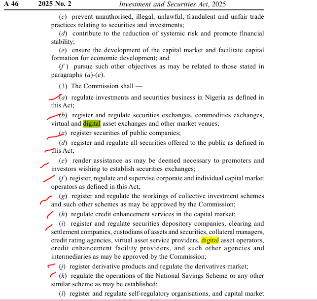 It rather says that the Securities & Exchange Commission (SEC) who regulate the capital market in Nigeria, now have the authority to regulate cryptocurrency & commodity exchange businesses.