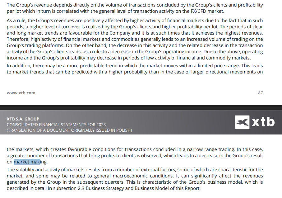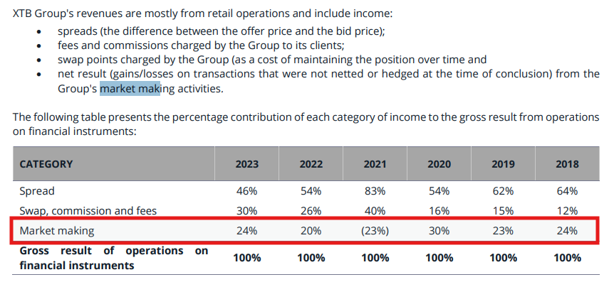 This is another screenshot from XTB's 2023 annual report explaining how they make money and you will see that market making is one of the ways.