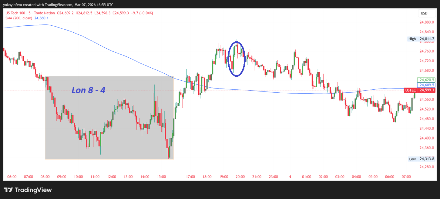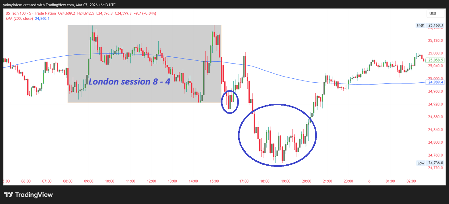 Let us look at another example, on Tuesday 3rd March 2026 price breaks out of the London range, and reverses back into it.