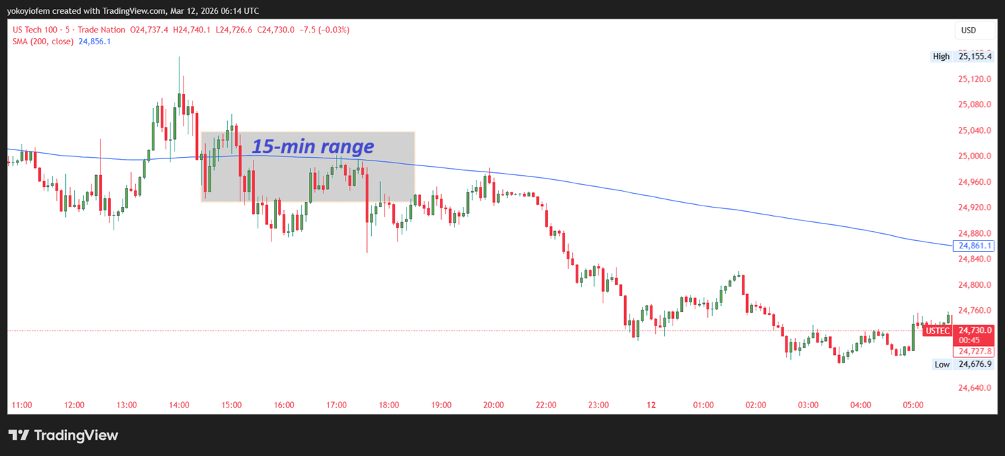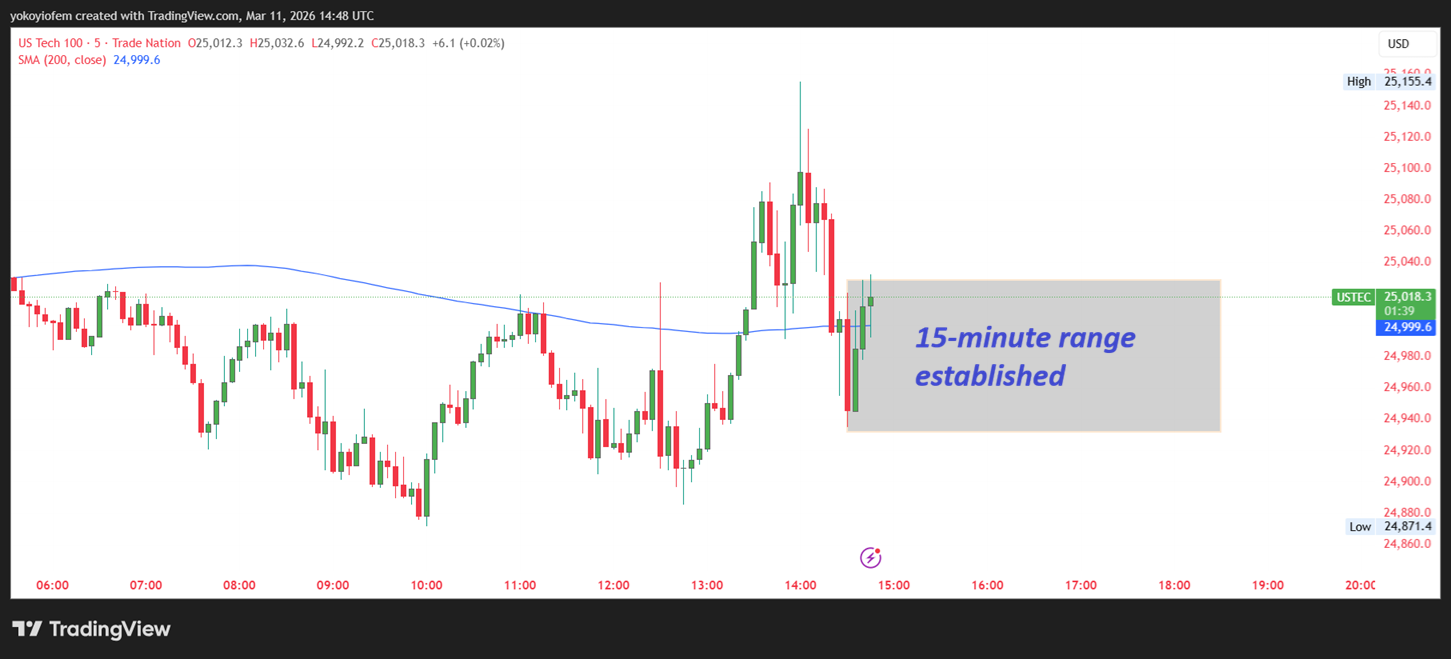 15-minute Nasdaq 9:30 am opening range has been established, and now we wait for price to breakout of the range then we trde the direction of the breakout.