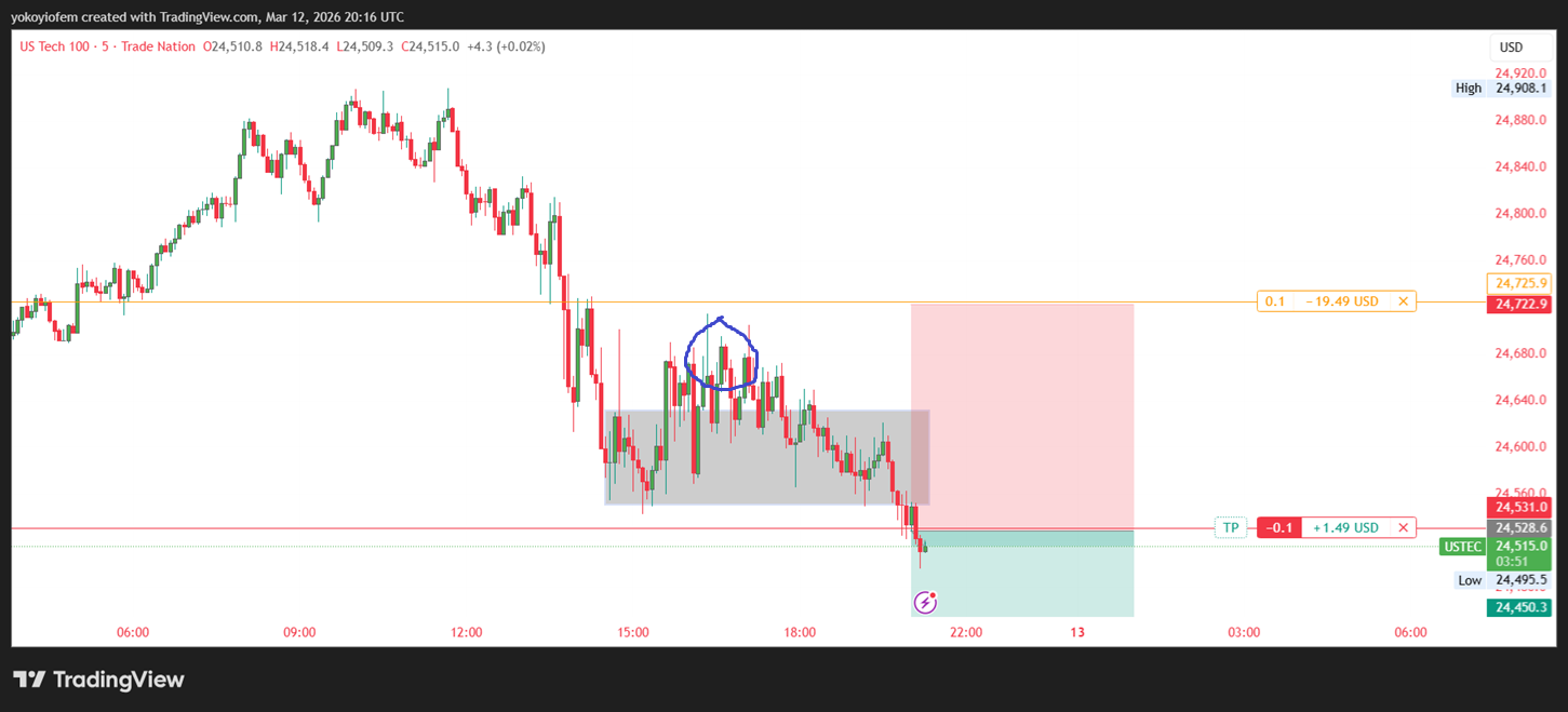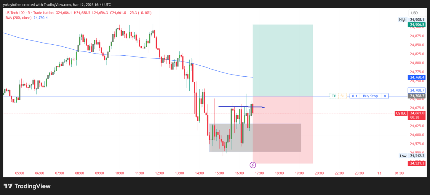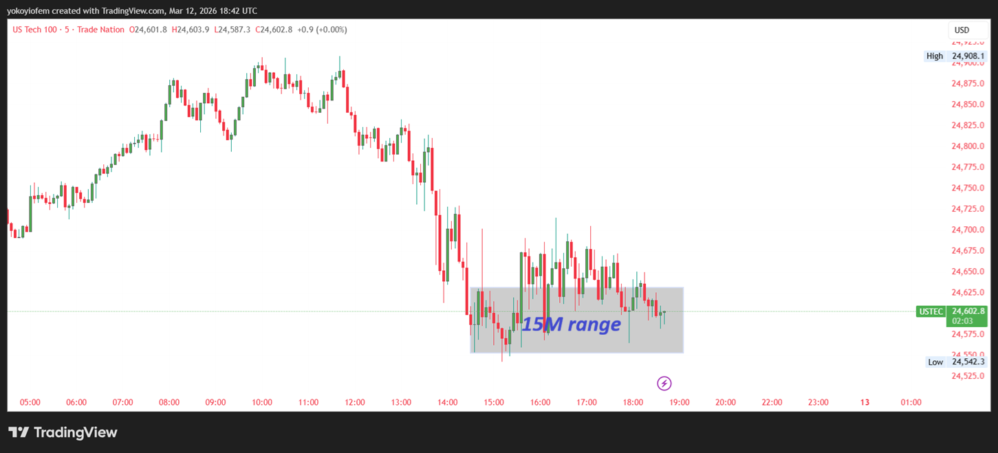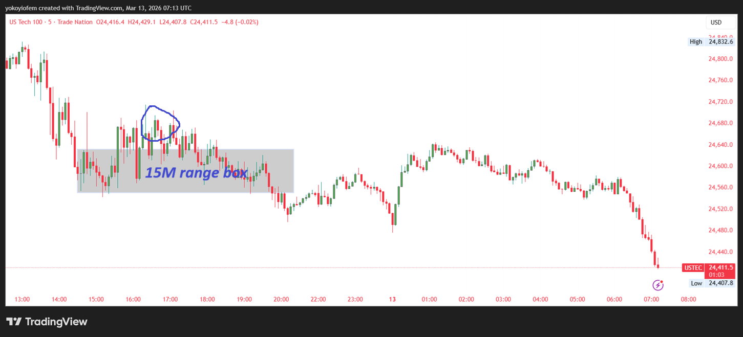 The Nasdaq stock exchange opened by 9 30 am in the US (equivalent to 3:30 pm in NG) so I waited for 15-minutes to mark the 15-min range. Now I will wait for price to breakout & close outside the range then i trade accordingly.