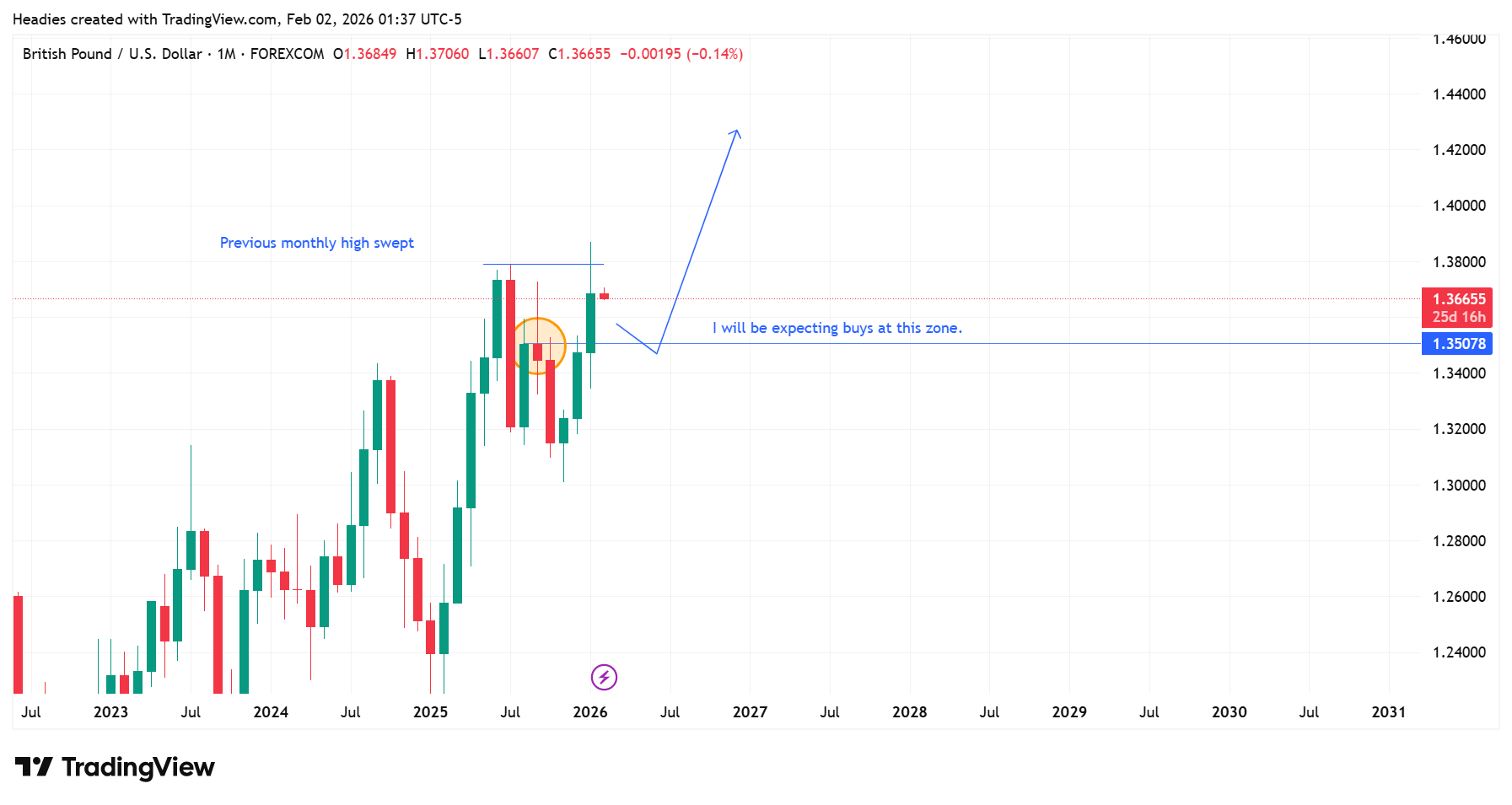 GBPUSD is still very bullish on the monthly timeframe. Well, last month candle swept a previous monthly high rejected and closed. This means we will have some retracement to the downside. The buys for me will start at the zone i marked for buys.