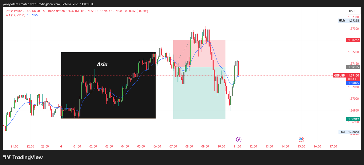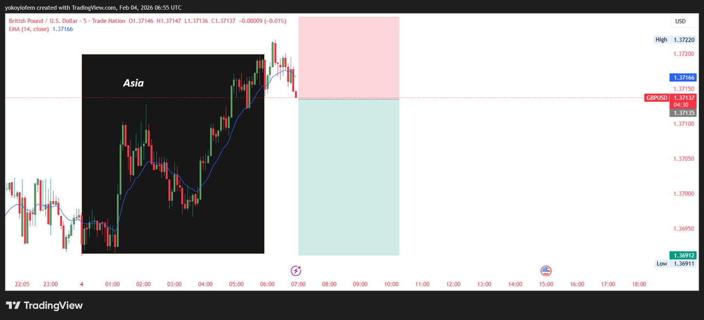 GBP/USD sell opportunity because price has broken out of the Asian session range and is reversing back into it.