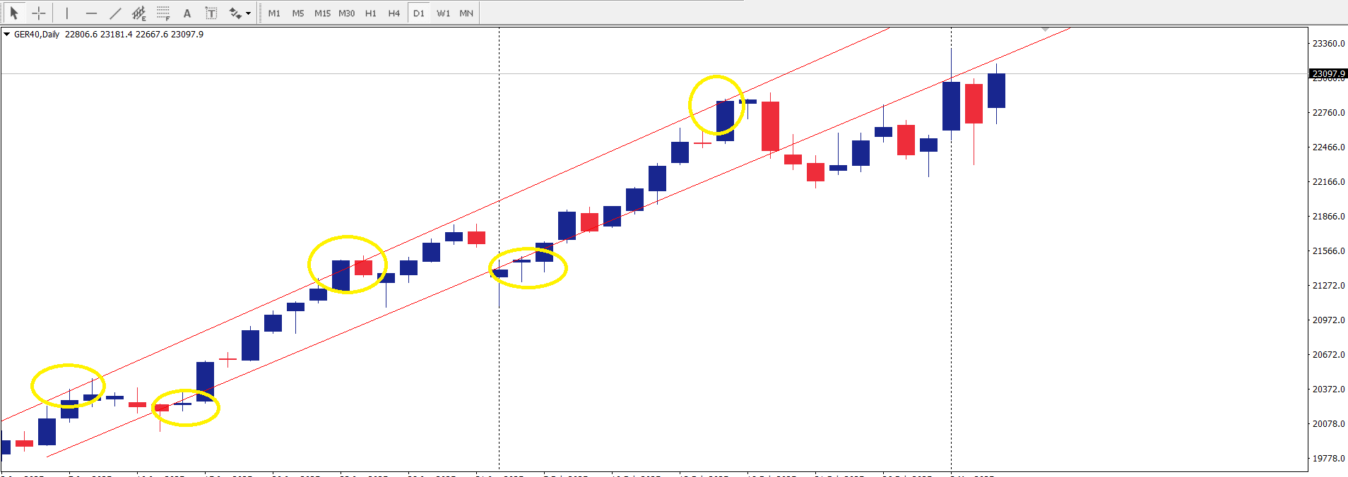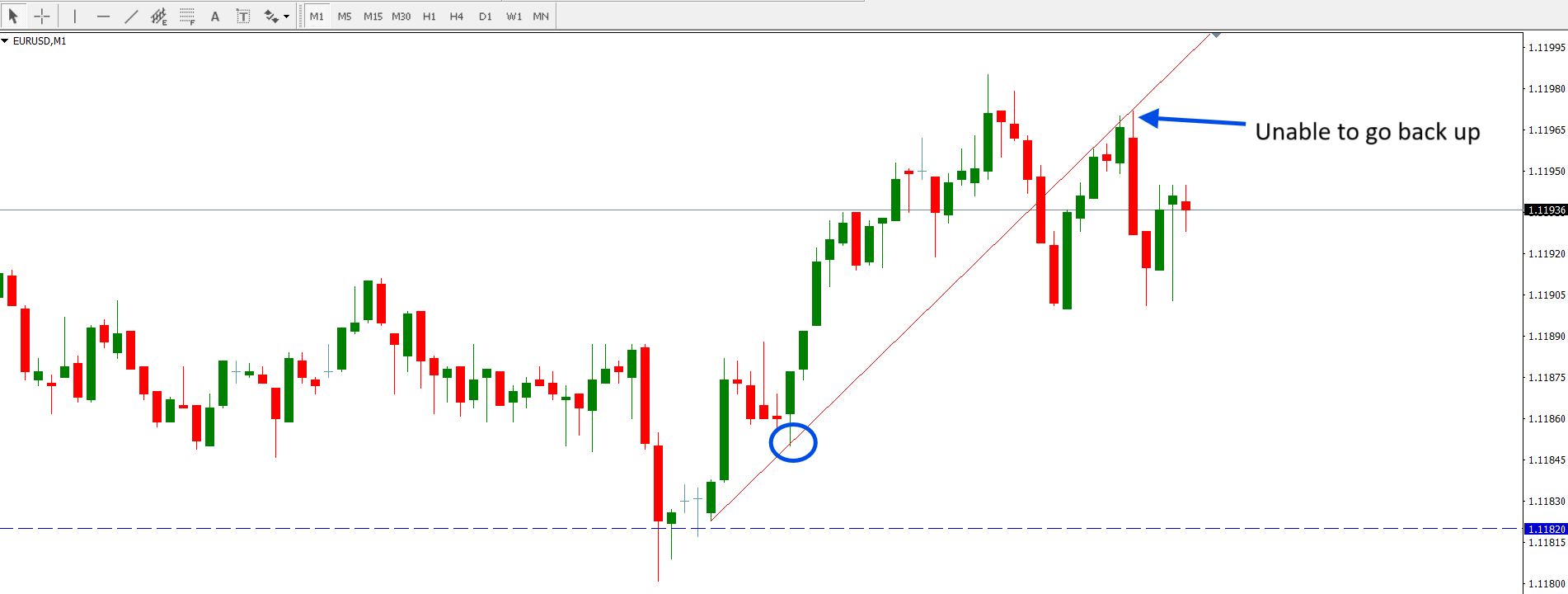 Trend line strategy is actually a simple one, you pick a trend and use the trend line tool to draw a line to touch the wicks of the trend.