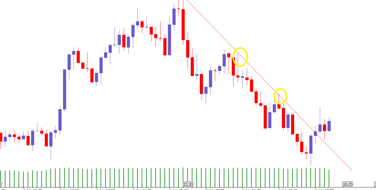 If it a downward trend, the trend line has to touch at least two wicks on the trend to be credible.
