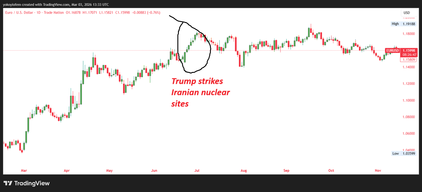 It wasnt this year. Trump ordered the US military to strike Iranian nuclear targets in 2025 and this was the eurusd market reaction for the next week. The strike happened on a Sunday so the markets began reacting from Monday. The us dollar actually got weak as a result which is the opposite of what is happening now.