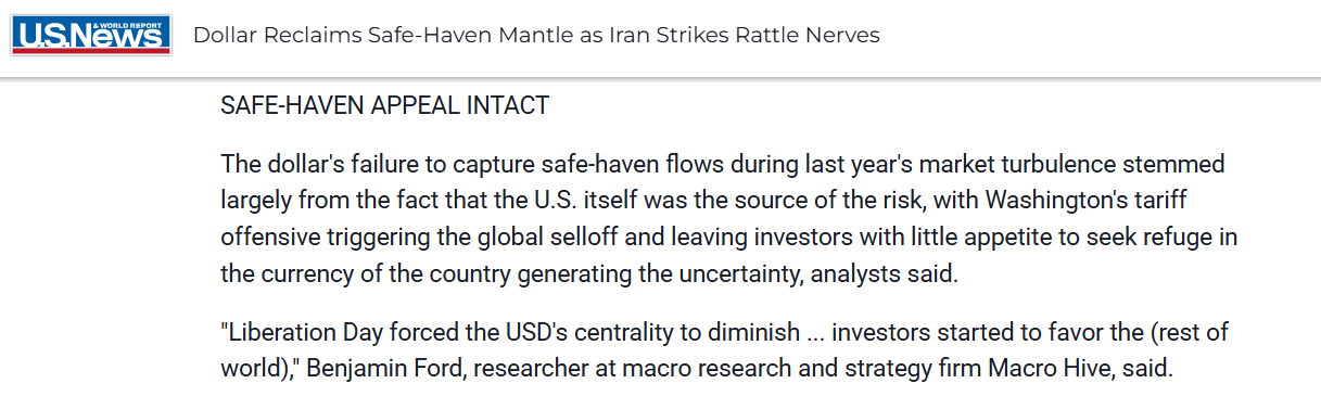 During the tariff wars the US Dollar couldnt function as a safe-haven currency because the tariffs were coming from the USA itself. The US was the source of the problem, but in this case Iran is the one destabilizing the region so investors see the USD as safe haven