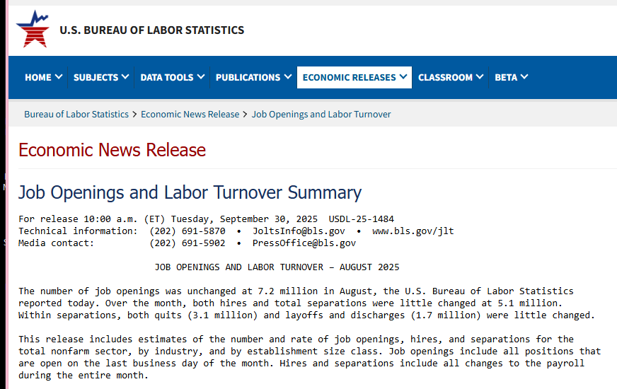 JOLTS (Job Openings & Labor Turnover Summary) is an American data survey that tells us the number of job vacancies and job resignation/separation for a given month in the United States nonfarm sector.