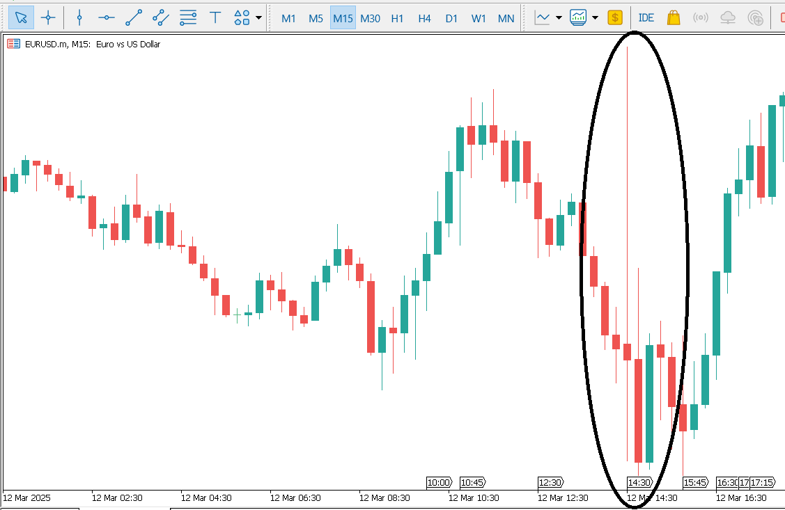 When CPI is released by 2:30 PM, the markets are going to react turbulently and you will see a big candle form by exactly 2:30 PM (see encircled candle in attached image), followed by more volatile price action.