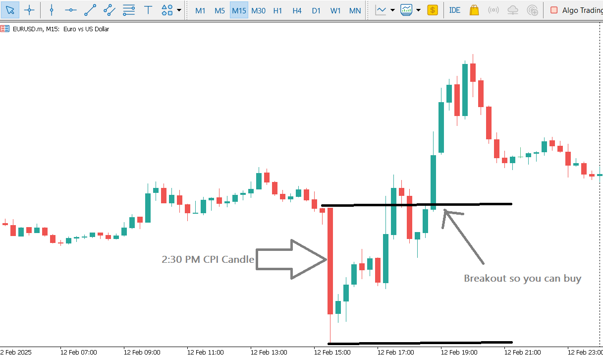 A simple strategy for trading CPI is to mark the highest and lowest points of the first 15 minute candle that forms when cpi is released. After that, wait for price to break through the upper or lower line you marked then you trade the break accordingly after confirmation/retest of the breakout level. .
