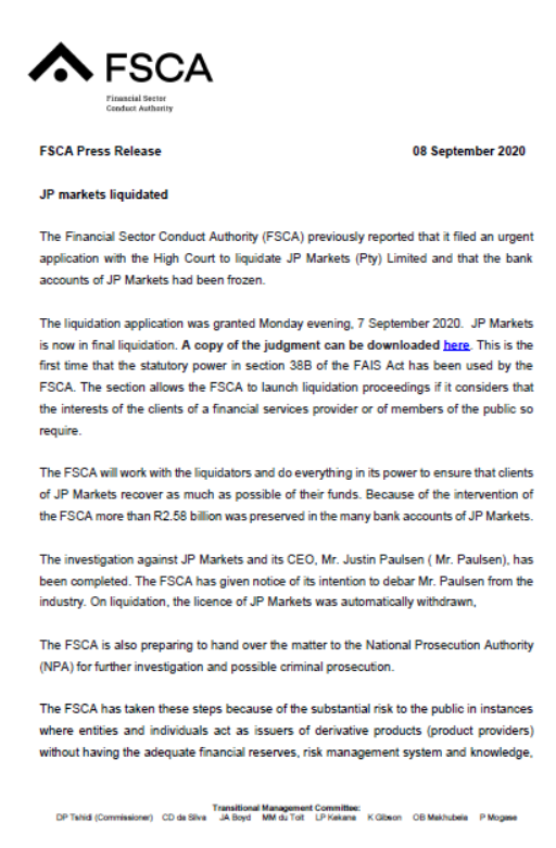 The FSCA was able to get a high court order to liquidate JP Markets.