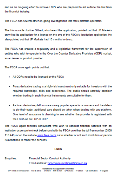 However, JP Markets license was suspended by the FSCA in 2020 & the FSCA moved to liquidate JP Markets for illegally acting as an Over-the counter Derivative Provider (ODP).