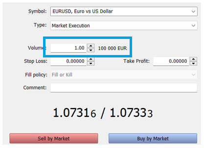 When you enter the digit “1” into the volume box, you are telling the system that you want to trade a standard lot (meaning 100,000 units).