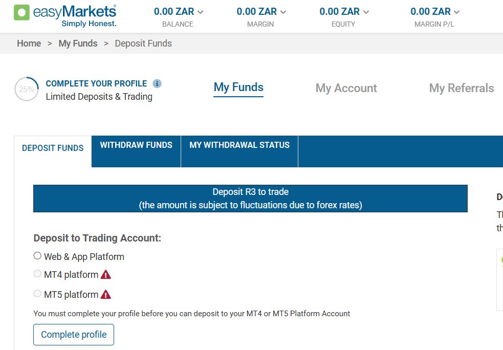 The Easy Markets minimum deposit is 3 ZAR for the MT4 & MT5 Accounts and $25 for the TradingView Account.
